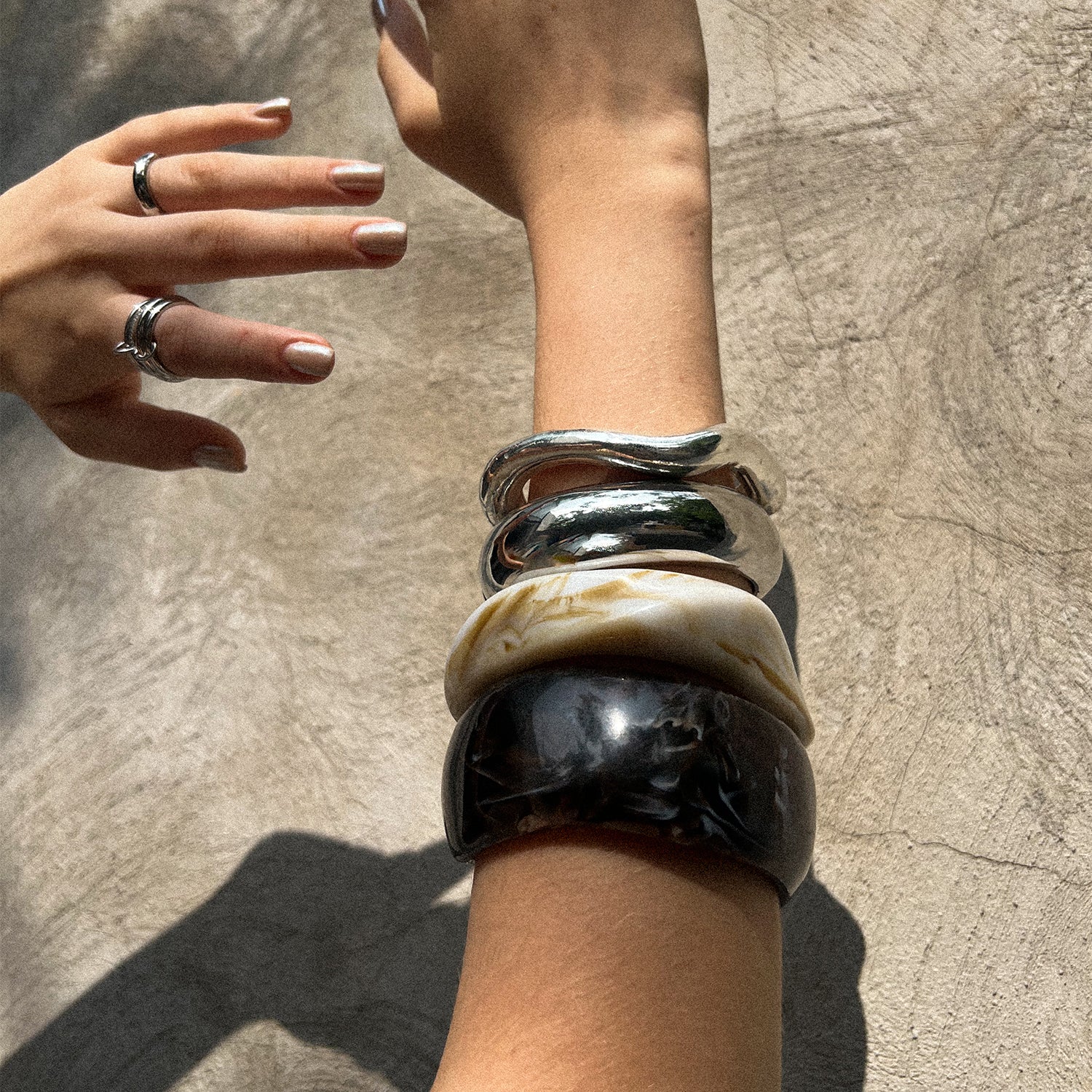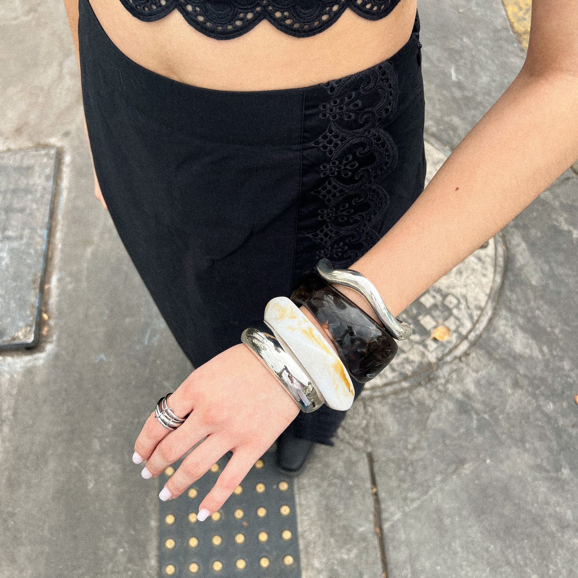 Brazalete acrílico en tono marrón con efecto carey profundo, ideal para sumar textura y calidez a un look minimalista o neutro.