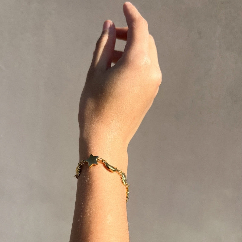 Pulsera con dijes alternados de lunas, soles y estrellas en acabado brillante. El diseño juega con símbolos clásicos y volumen suave para crear una pieza fácil de combinar en stacks o llevar sola.