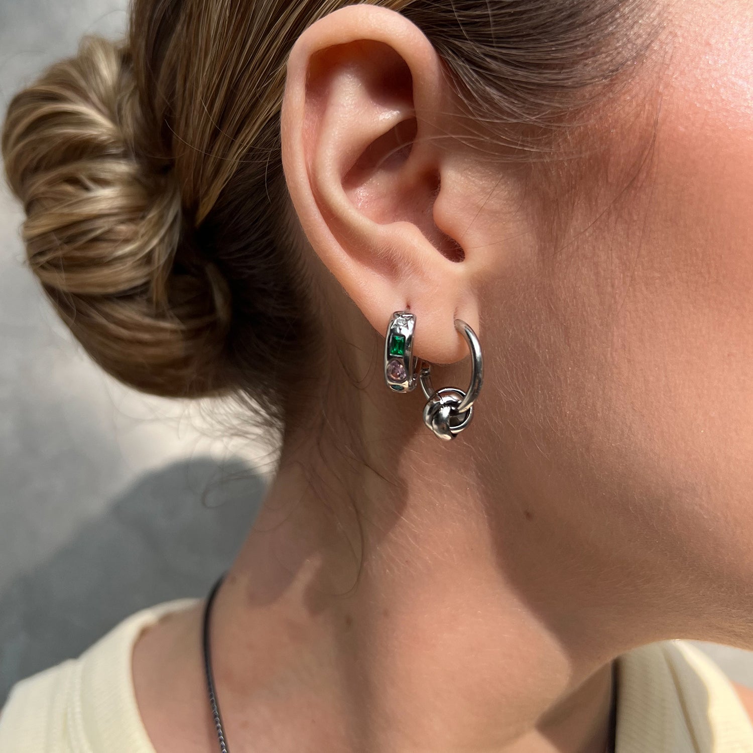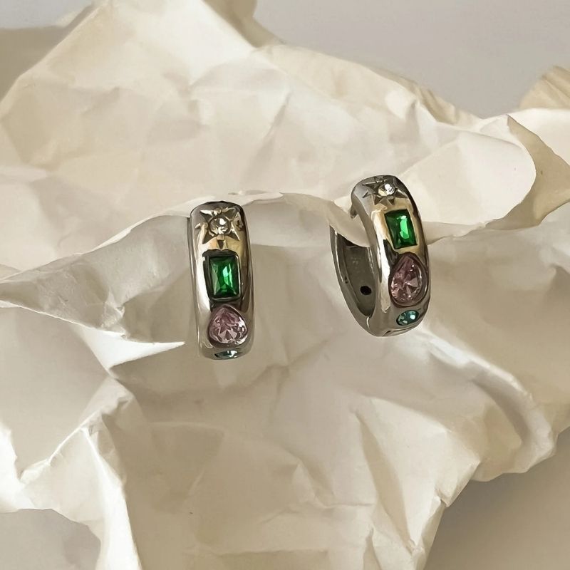 Aretes de argolla con incrustaciones multicolor, diseñados para aportar un toque distintivo y contemporáneo.