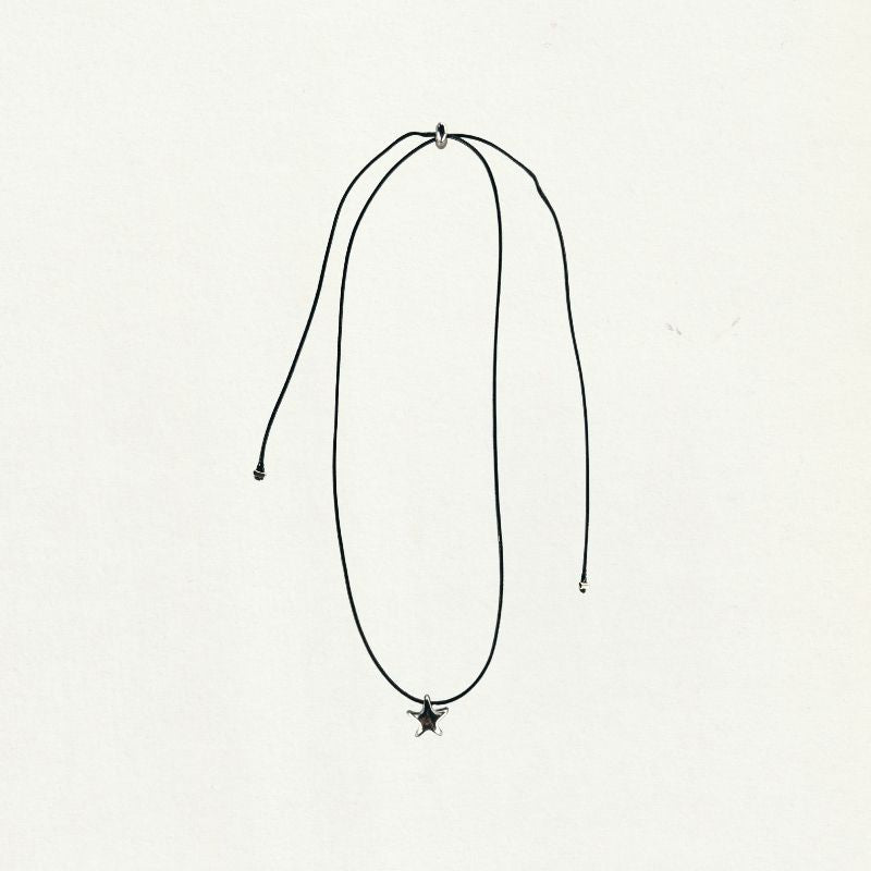 Collar en acero inoxidable con dije de estrella pulida y cordón negro ajustable. Una pieza de inspiración Y2K que combina brillo metálico con un acabado casual y ligero.