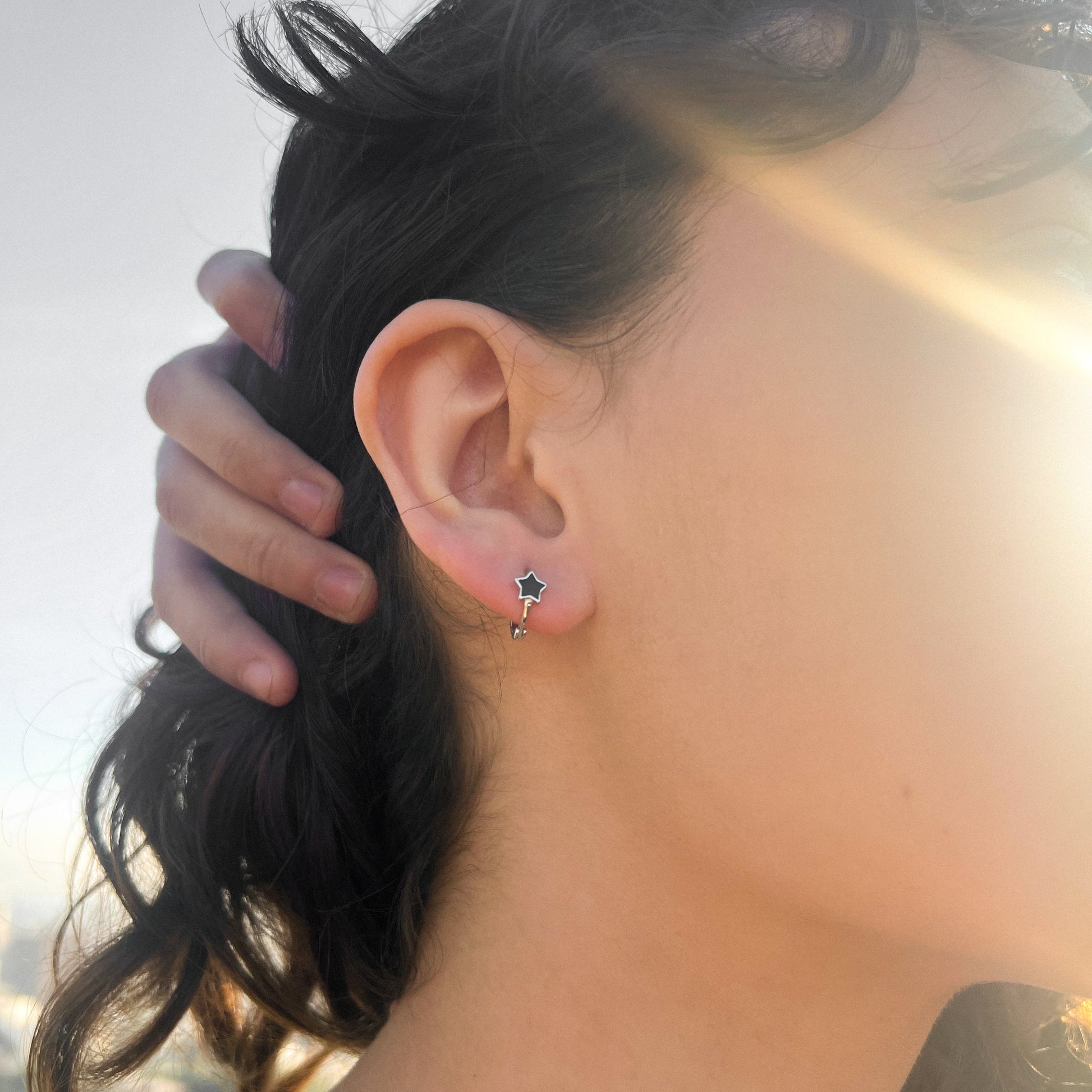 Descripción Arracadas mini en plata 925 con estrella esmaltada en negro. Su tamaño de 0.8 mm las hace perfectas para segunda o tercera perforación, aportando un toque sutil con un diseño distintivo.