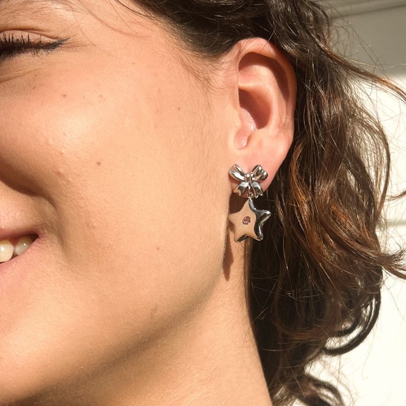 Descripción Un moño escultórico sostiene una estrella pulida con un destello rosa al centro. El contraste entre volumen y brillo crea una silueta compacta con carácter lúdico y pulido.